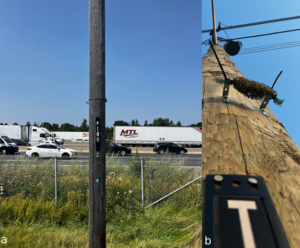 Foto – a. Sito di indagine, in prossimità della “Highway 401”. b. Trapianto lichenico esposto